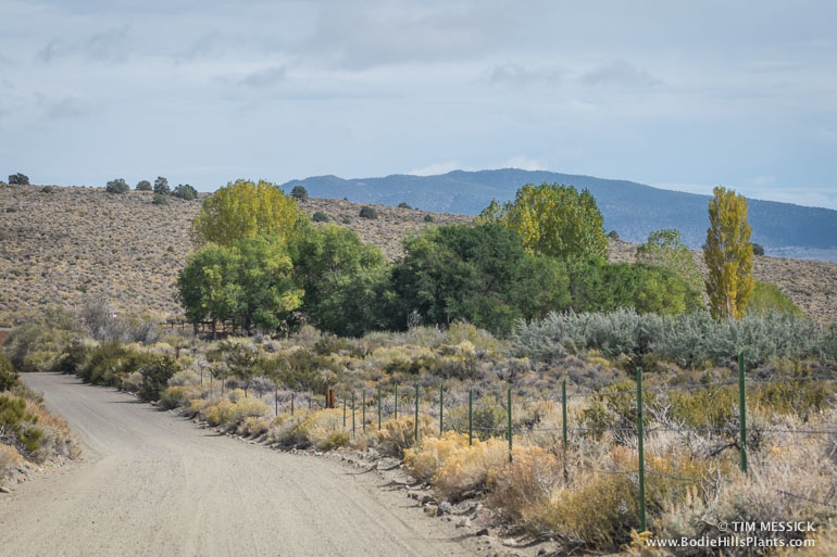 The trees in Cottonwood Canyon would not have been aspens (Populus tremuloides), because aspens are never called “cottonwoods” and aspens in the southern Bodie Hills grow at higher elevations. It’s unlikely they would have been the European cottonwoods that were planted by early settlers at settlements in the Mono Basin and Bridgeport Valley—white cottonwood (Populus alba) and Lombardy poplar (Populus nigra ‘Italica’). There are no settlements or ranches in Cottonwood Canyon, other than Flying M Ranch, which is along this drainage but well south of the canyon itself.