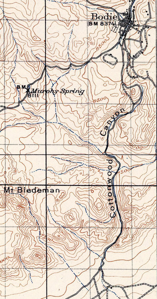 According to GeoNames, there are at least 19 places in California named “Cottonwood Canyon”, at least 18 more in Nevada, and perhaps 280 in all, nation-wide. This does not include all the places named “Cottonwood Creek,” “Cottonwood Wash,” “Cottonwood Spring,” etc. One of these Cottonwood Canyons is in the Bodie Hills, just south of Bodie. Many visitors to Bodie come or go via the Cottonwood Canyon Road, which meets State Route 167 just north of Mono Lake. This is one of the oldest and historically most used routes into Bodie.