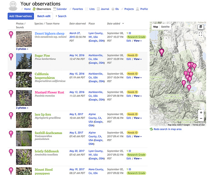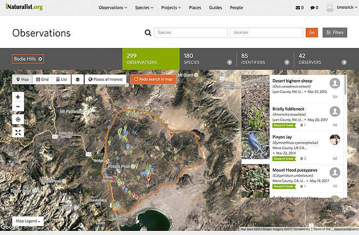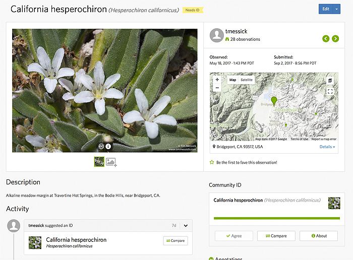 For me, iNaturalist is one more place (aside from the Consortium of California Herbaria, Intermountain Regional Herbarium Network, and CalFlora) where I can see what others are finding in the Bodie Hills, Hot Springs Valley, and other places I like to visit. It’s also a way to get acquainted with some invertebrates and other organisms that I don’t have the training to identify easily myself. You can also help other people identify what they’ve observed, ask for help identifying some of your observations, create “Places” (like the Bodie Hills) as geographic filters for lists of observations, and follow or communicate with other observers. There’s also an app that lets you record observations in the field.