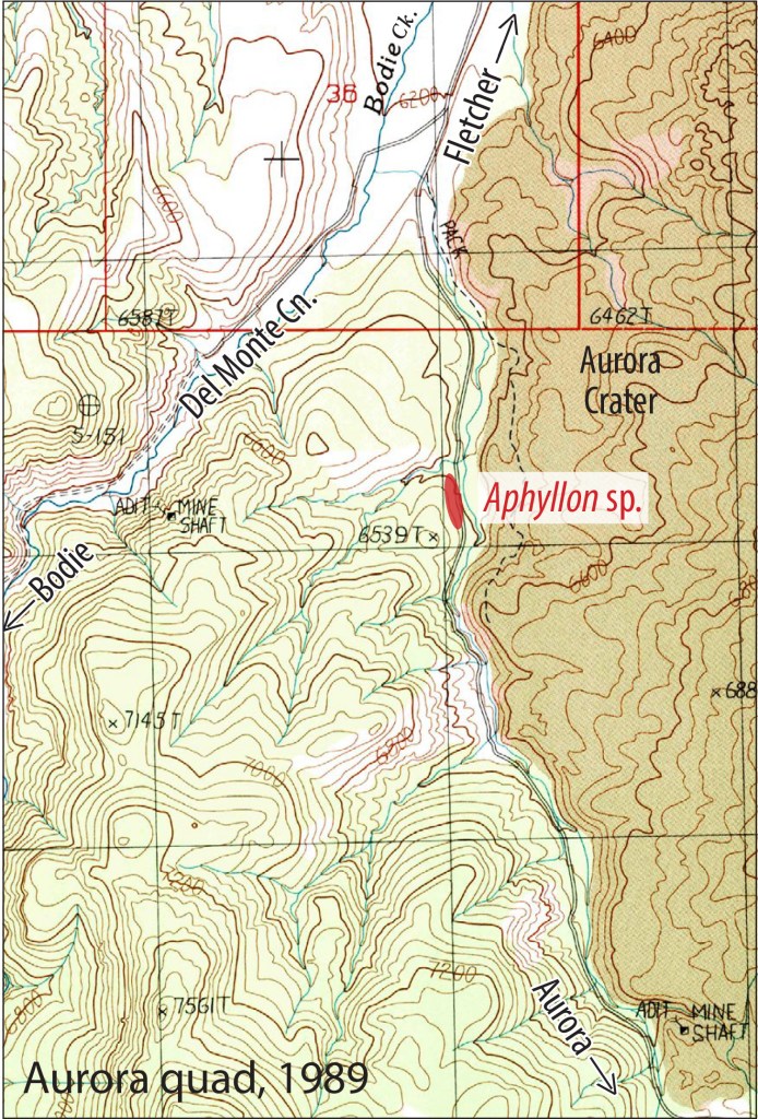 This plant has been observed twice, in June 2021 and April 2022 at the base of a road cut along the road to Aurora (Mineral County, Nevada), about 0.85 mile south of the intersection with the road through Del Monte Canyon to Bodie (elevation about 6,400 feet). Both times the plants were well past flowering, dried out and crumbling to the point where critical features for identifying the species were no longer present.