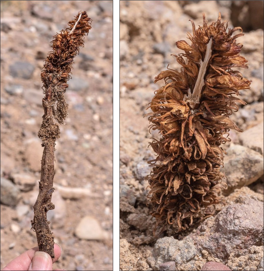 Our mystery plant also clearly has an elongate above-ground stem that bears flowers on short pedicels, as in Aphyllon parishii and several other species. In some other species the flowers emerge on much longer pedicels from a very short, below-ground stem—which is the case in two other species of Aphyllon found in the Bodie Hills: A. corymbosum and A. fasciculatum.