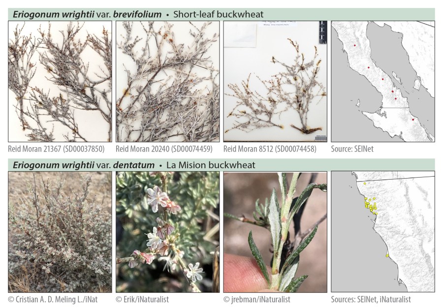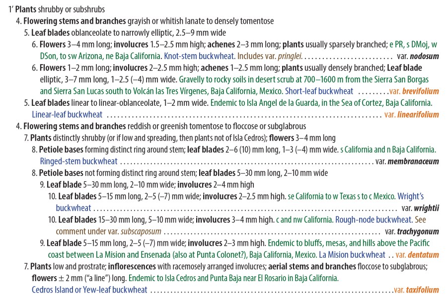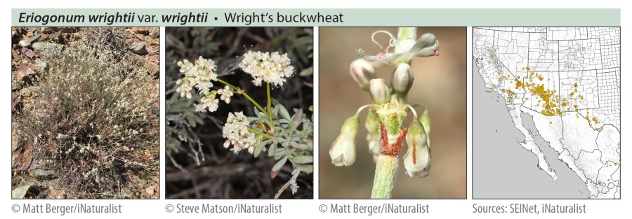 Eriogonum wrightii has 11 varieties in all: 5 occur only in Mexico (mostly in Baja California); the rest occur in the United States, but at least 3 of these extend across the southern border (and have certainly done so since long before there ever was a border). Most plants will run through the key without much difficulty, and some varieties are largely separate from the others geographically. Where taxon ranges may overlap, only 2 or 3 varieties will vie for your attention.