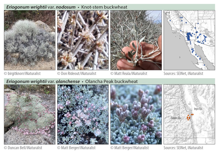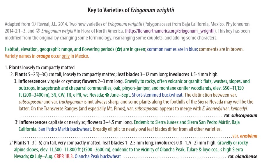 1. Hi Tim, nice work up on Eriogonum wrightii.I wish I could see more detail in the map, but I did notice E. w. nodosum circles in northern Inyo County. No iNat observations but SEINET shows four from Inyo County, three of which are along Highway 168 between Big Pine and Westgard Pass. They are all from 1930, all collections by Ralph Hoffman. They look more like E. panamintense.As you noted, some of the data points may be the result of misidentification.Regardless, it is nice to see a map and key that you have spent, I am sure, a lot of time on.All the best,Steve